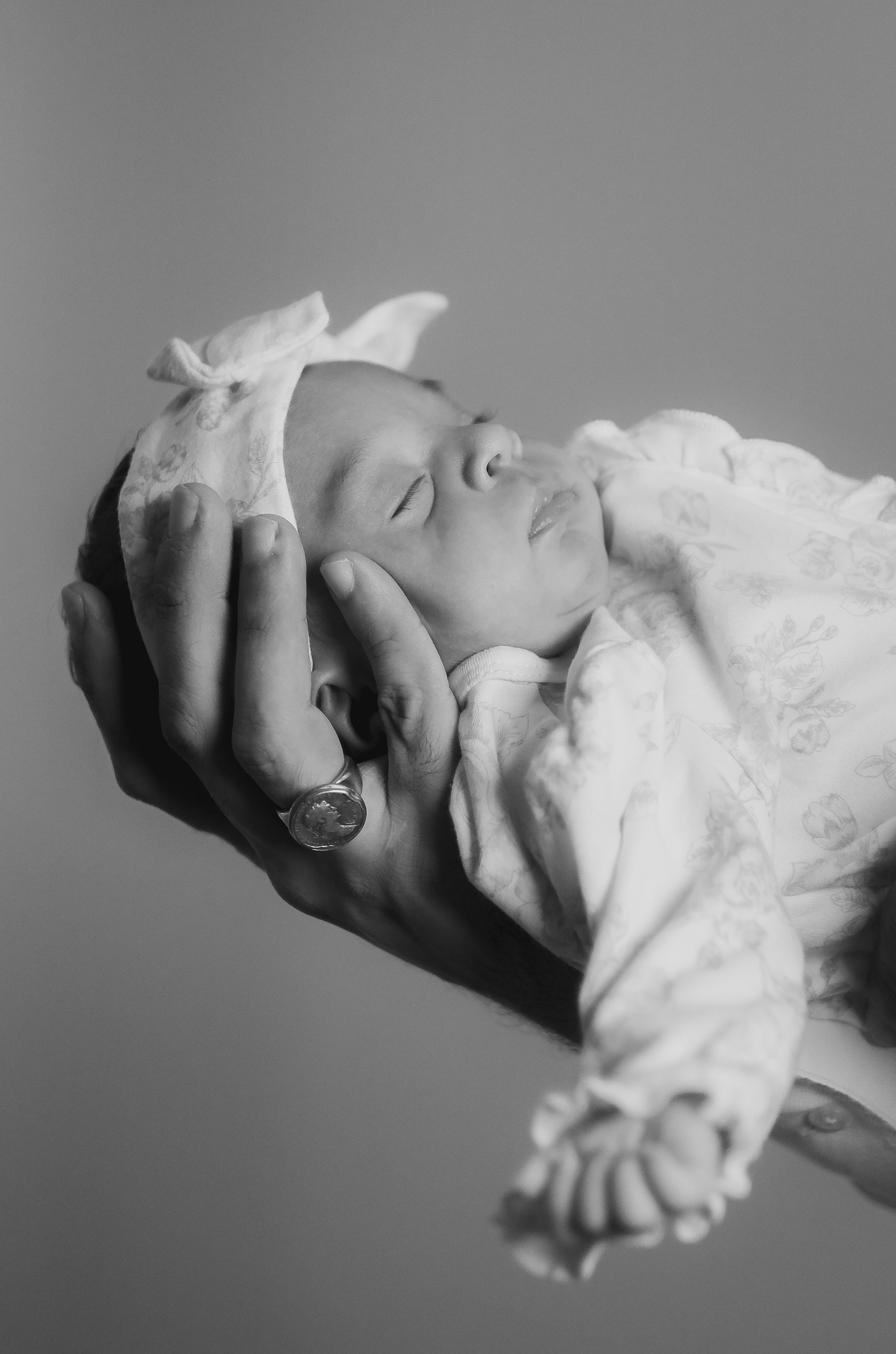 A daughter rests in her father’s hand, her entire world held within his grasp. The weight is almost nothing, yet it carries everything