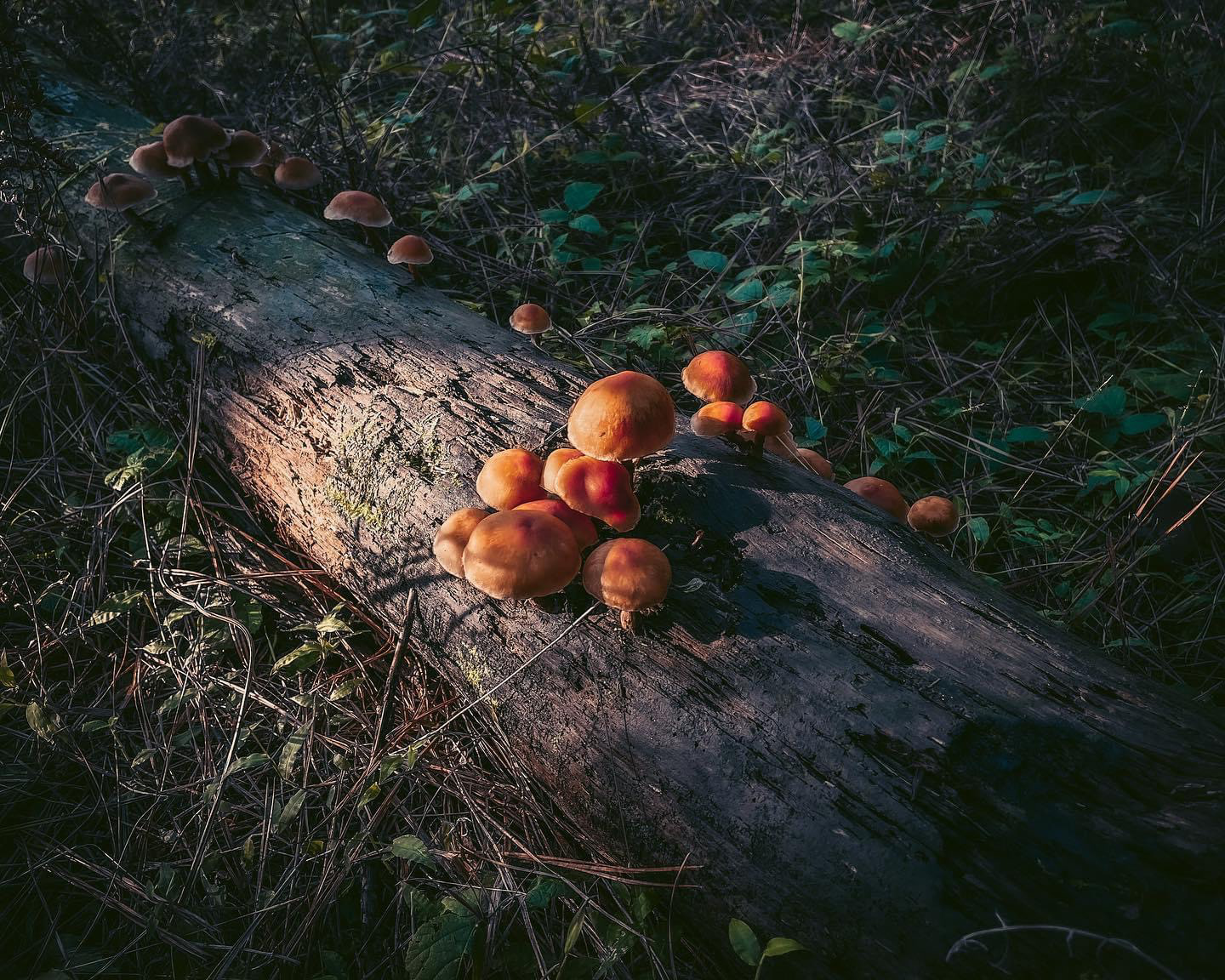 On the surface of a fallen tree, new life gathers. Mushrooms rise from decay, small yet luminous in the quiet forest. What seems like an ending becomes a beginning.